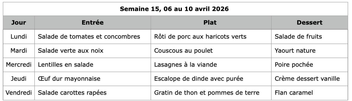 Un repas principal (entrée, plat, dessert) coûte 15 €.